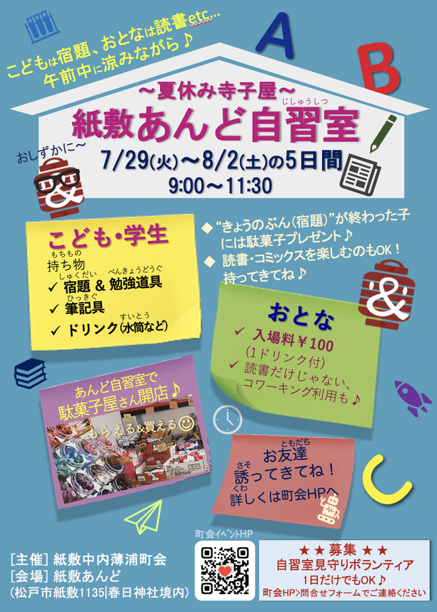 夏休み寺子屋を春日神社境内の紙敷あんどで開催します。 つまりは自習室。